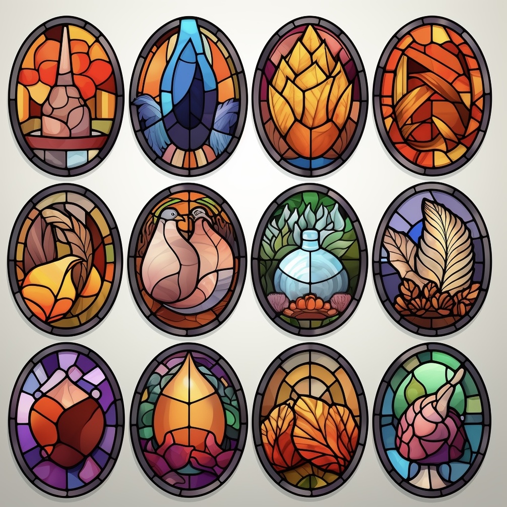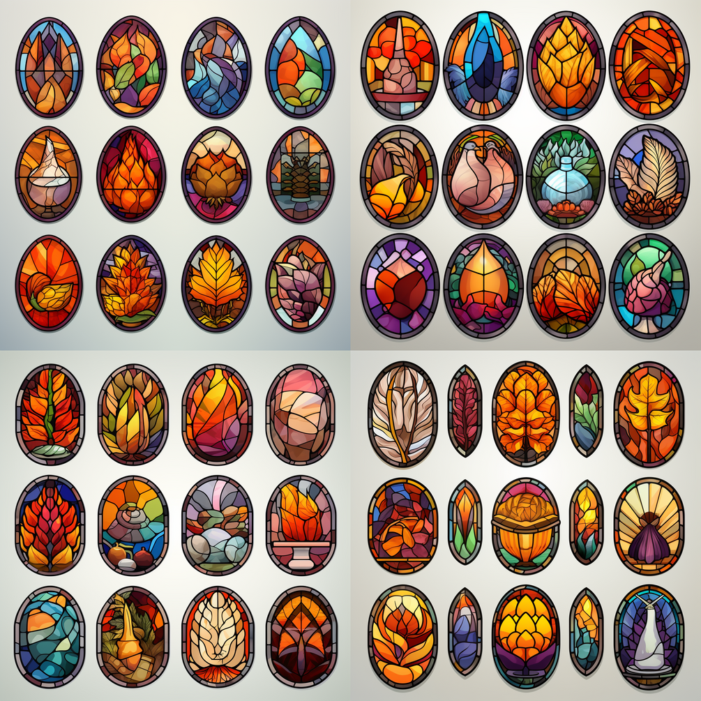 A 4 sheet set containing vector format designs for more than 40 Varied Sizes AI generated designs of Autumn Stained Glass.