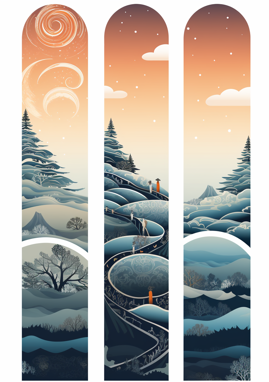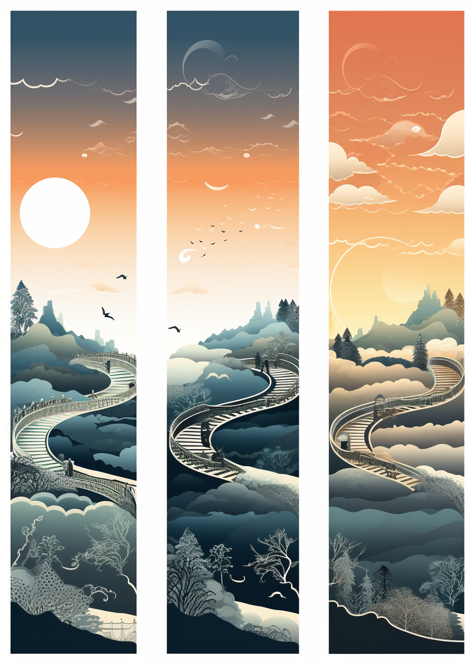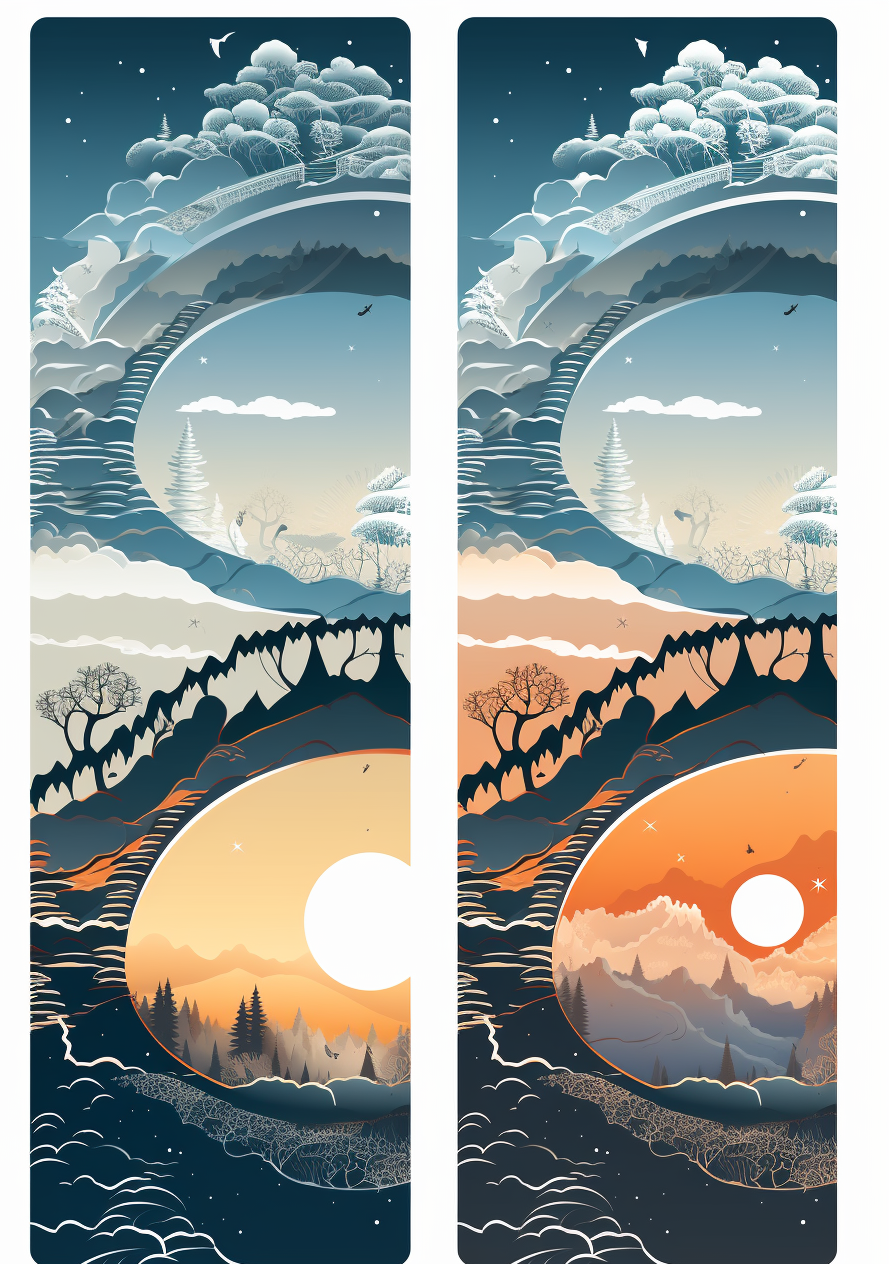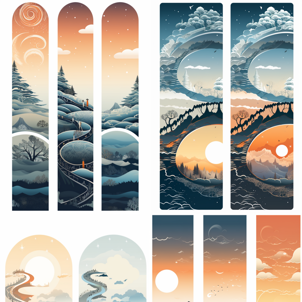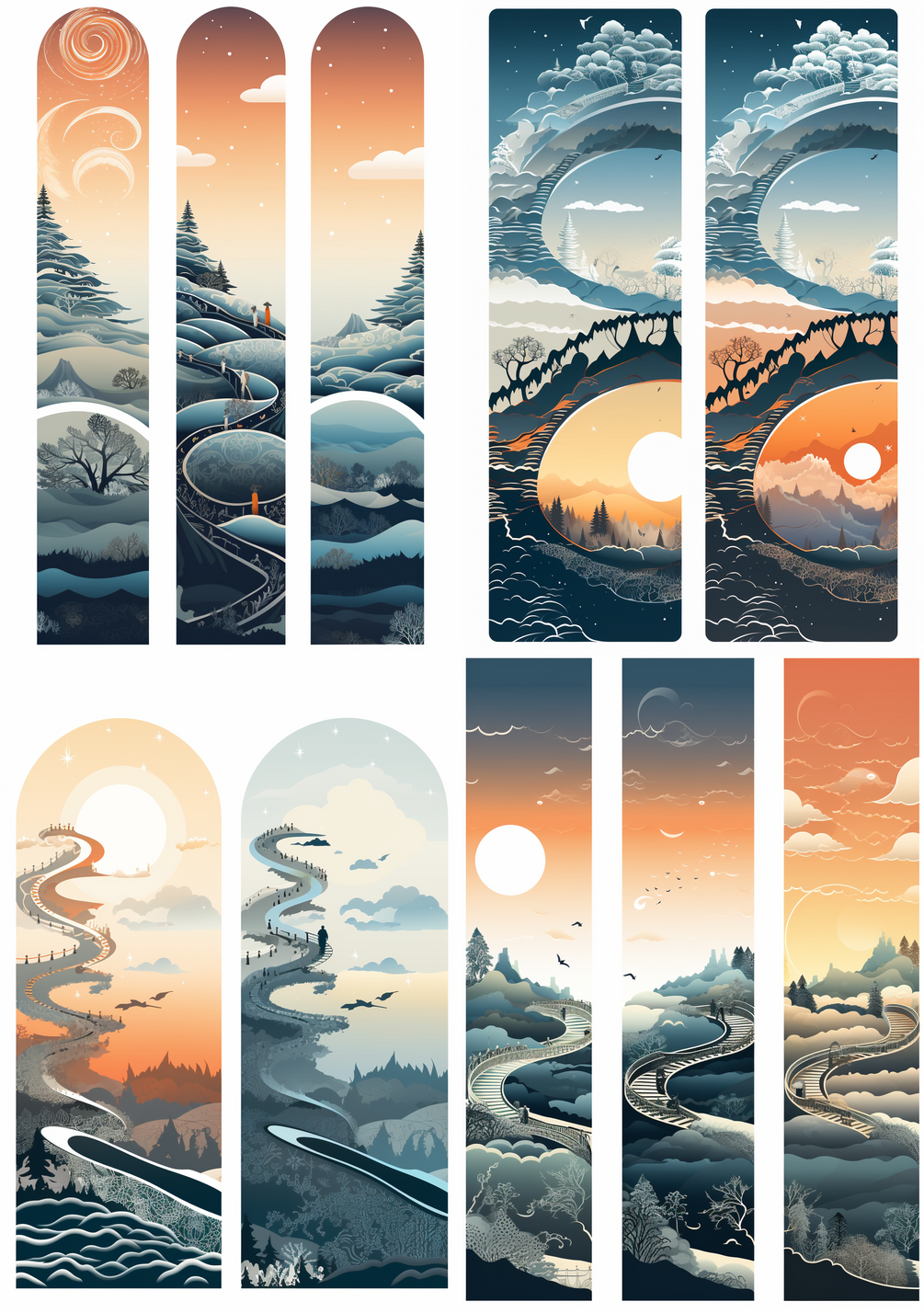 A 4 sheet set containing vector format designs for 10 Extra large AI generated designs of Country Landscapes at Sunset.