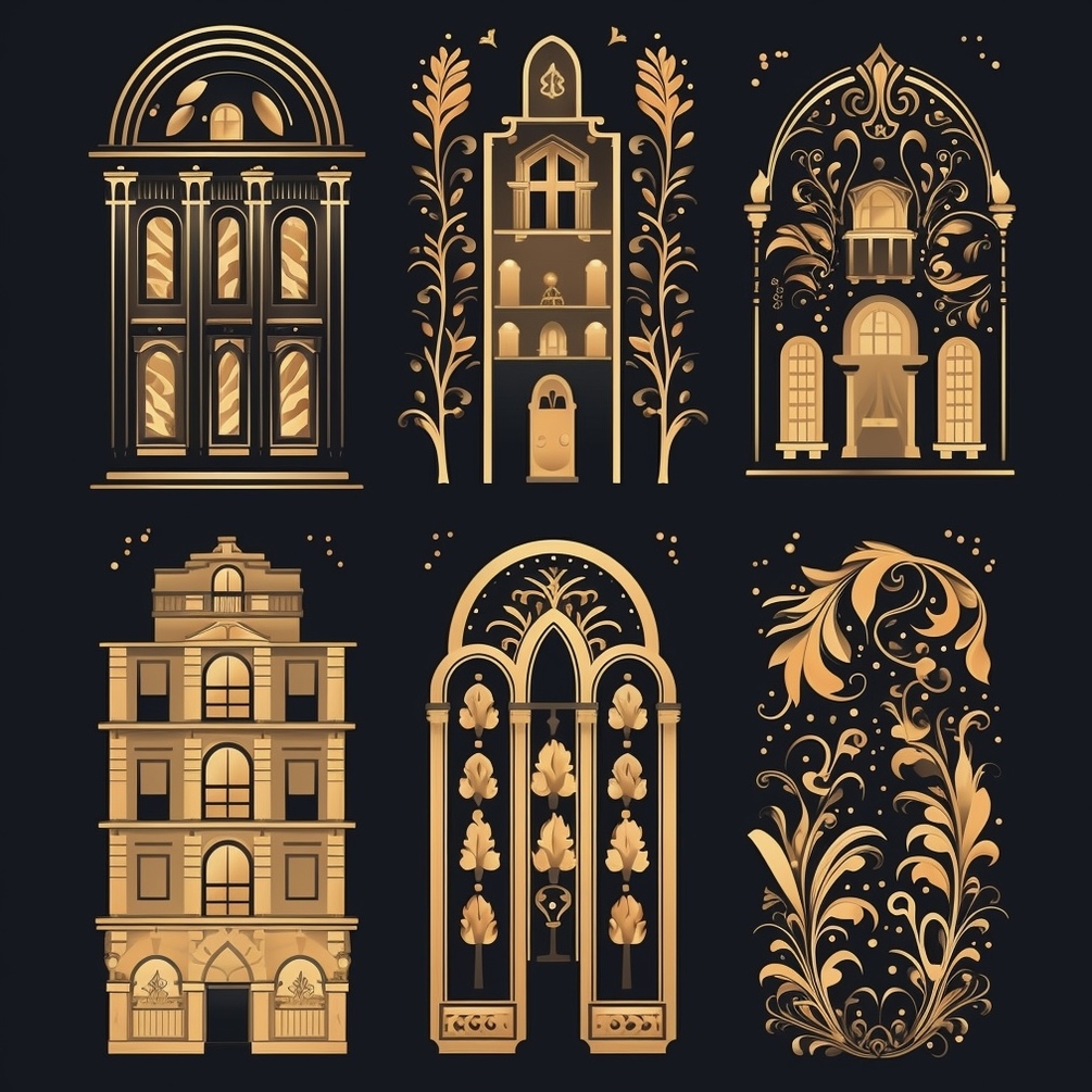 A 4 sheet set containing vector format designs for 26 Varied Sizes AI generated designs of Gold Architectural Details.