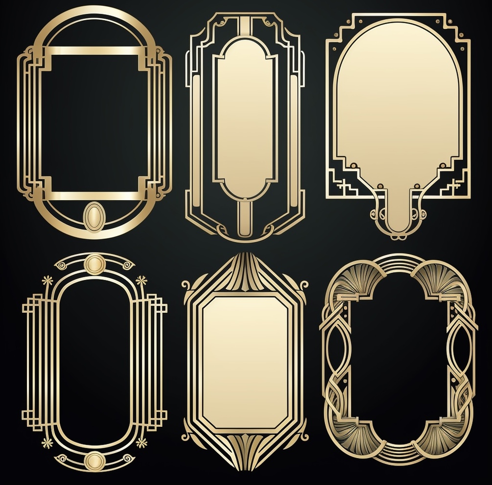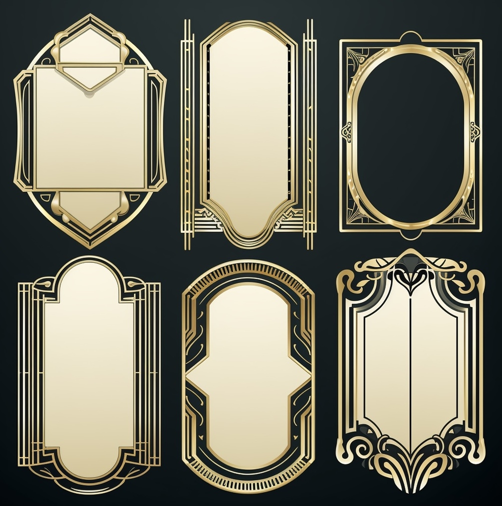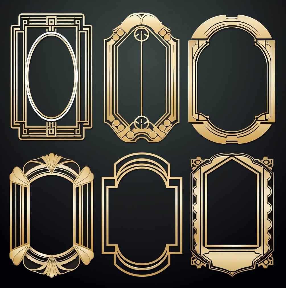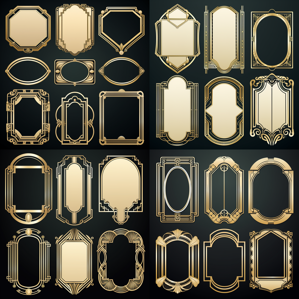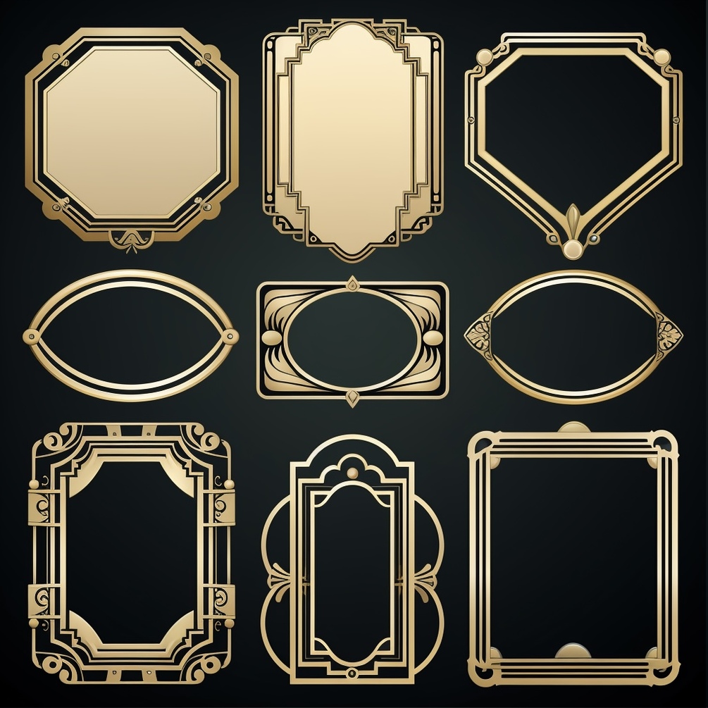 A 4 sheet set containing vector format designs for 27 Varied Sizes AI generated designs of Ornate Gold Frames.